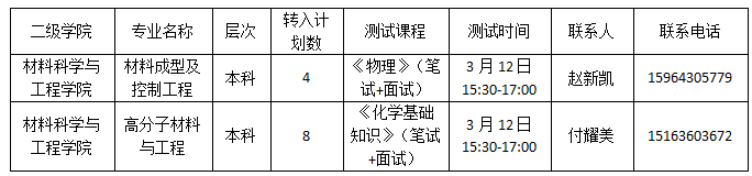 3月12日下午3点,材料科学与工程学院对转专业学生进行转专业测试,测试包括笔试和面试两部分,测试过程确保公平、公正、公开,按工作方案对拟转入学生进行相关科目测试,测试结束后向学生公布成绩。